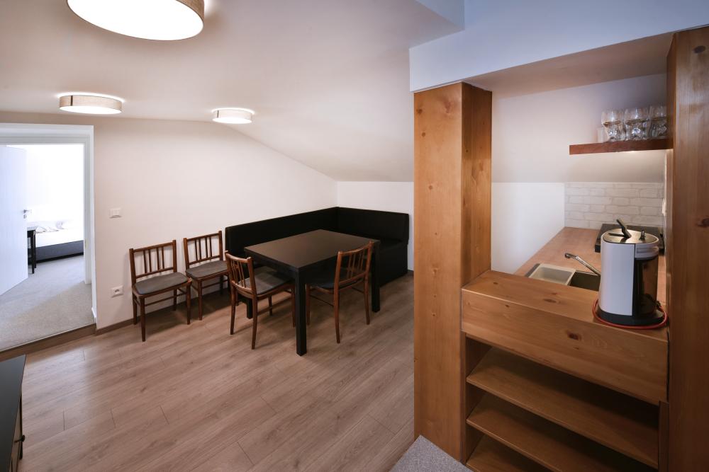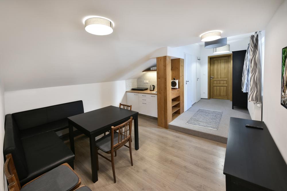 Súčasťou apartmánu je priestranná obývacia časť s pohodlným sedením a TV. Na obývaciu časť nadväzuje jedálenský kút so stolom a stoličkami, ideálny na spoločné stolovanie alebo večerné posedenia.