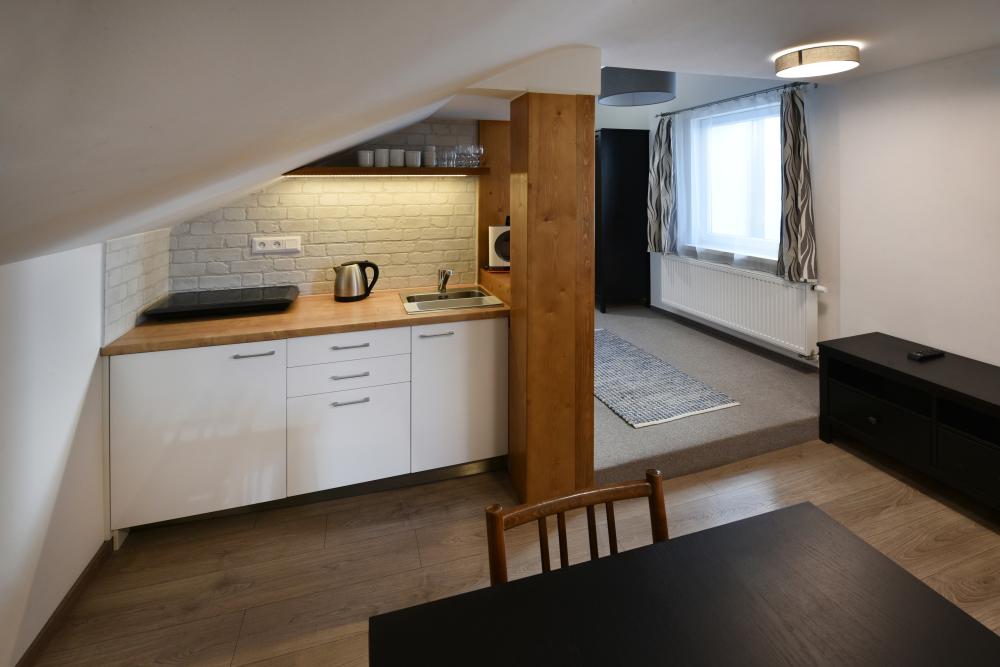 Plne vybavená kuchyňa je prakticky riešená a zahŕňa indukčnú dosku, chladničku, rýchlovarnú konvicu a základné kuchynské vybavenie a riad.