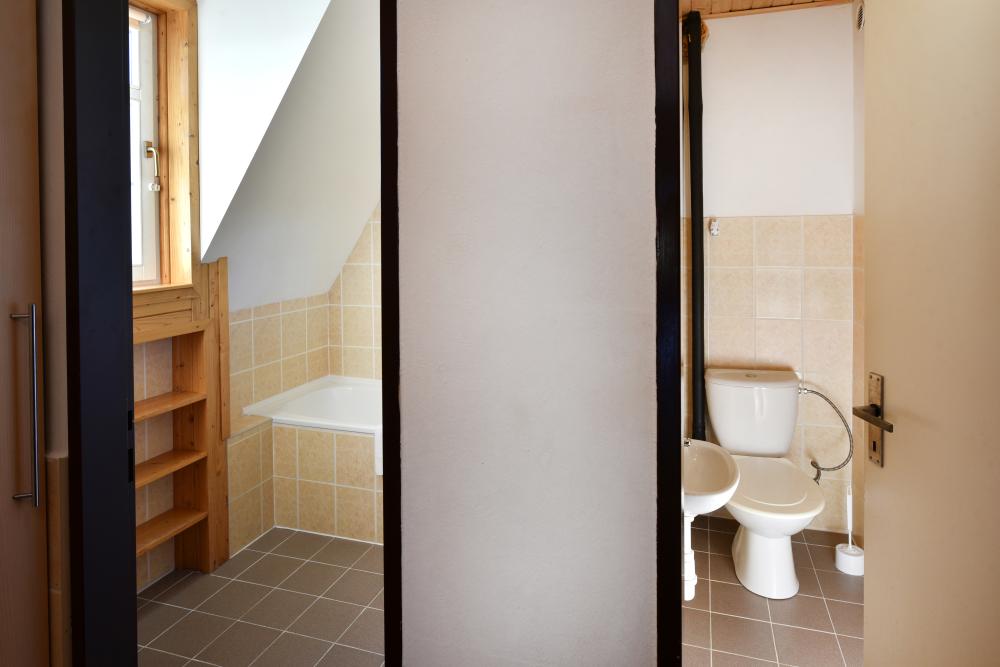 Na tomto podlaží sa nachádza aj kúpeľňa s vaňou a WC.