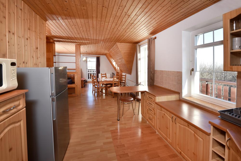 Mezonetový apartmán 6+2 ideálny pre rodiny alebo väčšie skupiny. Apartmán je riešený v útulnom horskom štýle s dôrazom na prírodné drevo, ktoré dodáva priestoru teplo a pohodovú atmosféru.