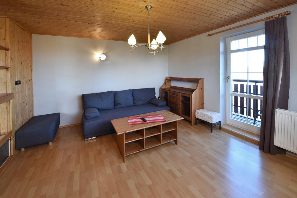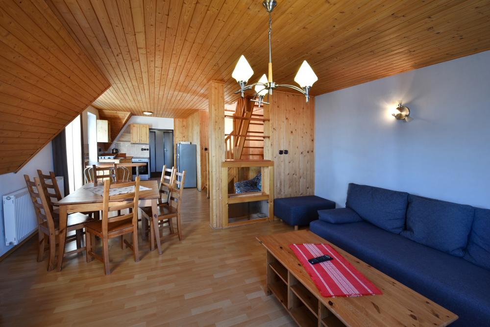 Apartmán je rozložený na dvoch podlažiach. Na spodnom podlaží sa nachádza priestranná obývacia izba s pohodlnou sedacou súpravou, konferenčným stolíkom a TV. Súčasťou otvoreného priestoru je veľký jedálenský kút s masívnym dreveným stolom a stoličkami, ideálny na spoločné stolovanie.